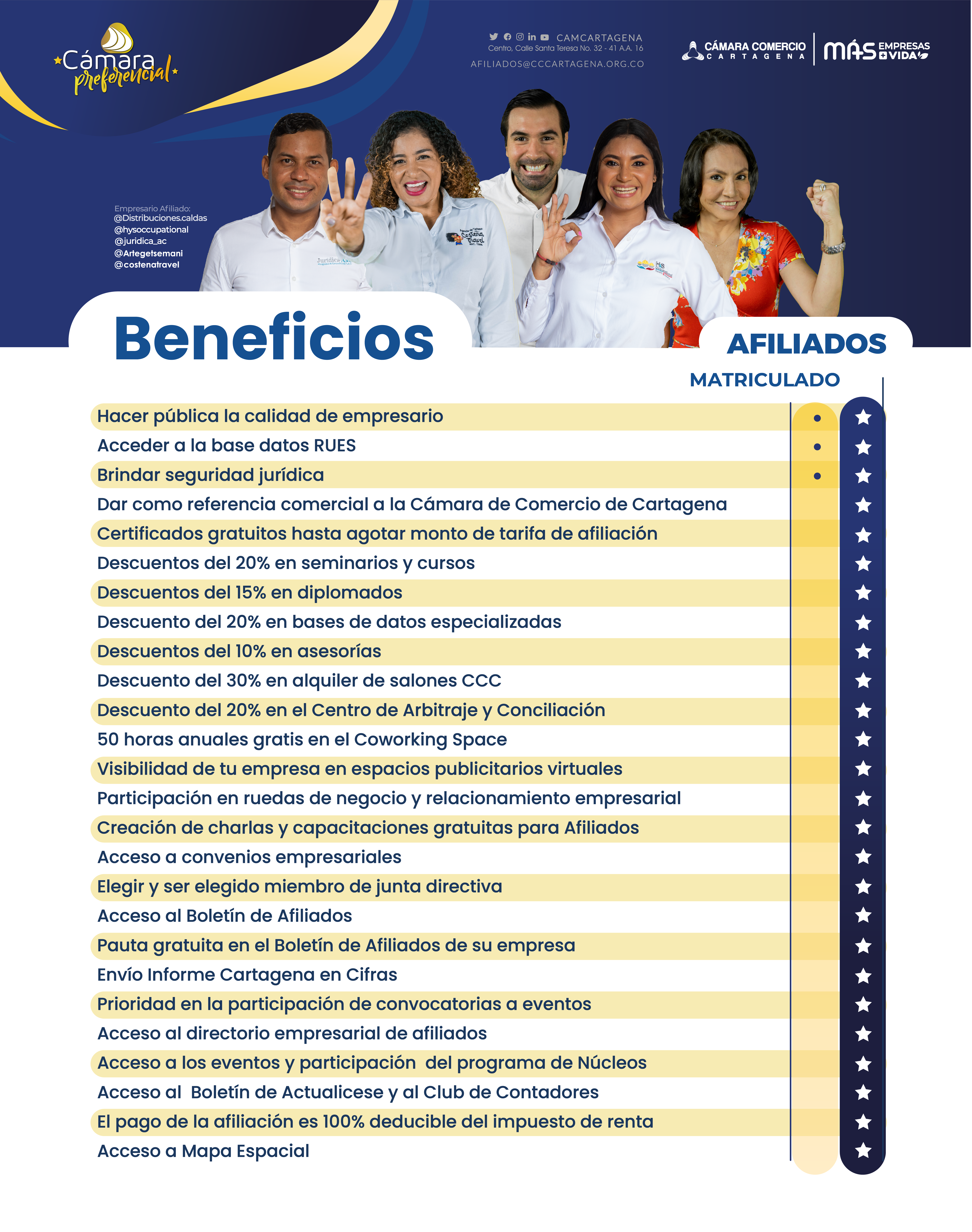 InicioAfiliado a Cámara PreferencialCámara Preferencial Tarifas Tarifas Boletín Boletín Reglamento de afiliados Reglamento de Afiliados Quiero ser Afiliado Quiero ser Afiliado Informes Adriana Barreto Villarreal Líder de Afiliados abarreto@cccartagena.org.co Teléfono: 316 415 6522 Escríbanos Llámenos (+57) (5) 6501110 Preguntas frecuentes PQRS Atención al cliente Ley de transparencia Reportes judiciales Solo para notificaciones: notificaciones@cccartagena.org.co Chatea con Virtualito Síguenos SeguirSeguirSeguirSeguir Sede principal: Calle Santa Teresa Nº 32-41 Cartagena, Bolívar Sedes y puntos de atención Protección de datos personales Aviso de privacidad