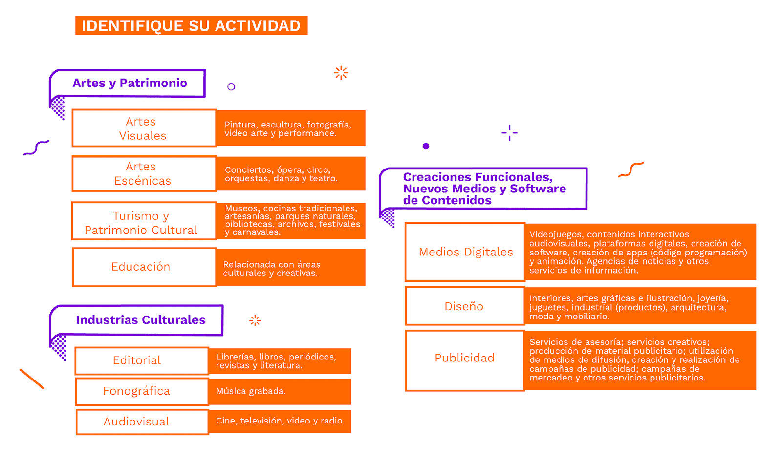 De acuerdo con el Ministerio de Cultura, las actividades que conforman la Economía Naranja son aquellas que hacen parte de las artes y el patrimonio cultural material e inmaterial, las industrias culturales y las creaciones funcionales.